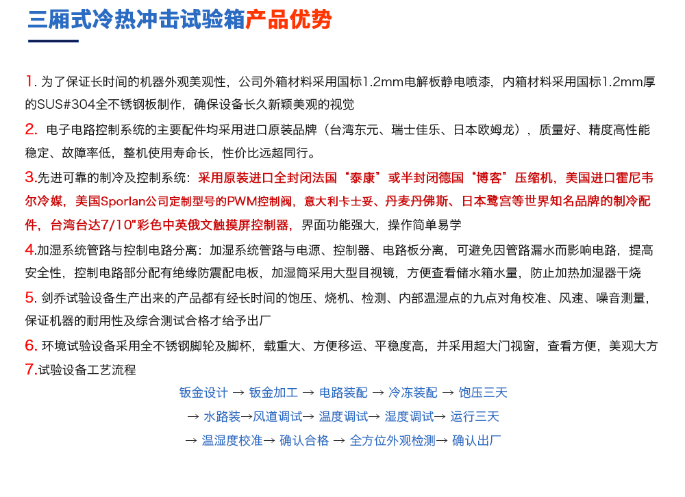 產(chǎn)品型號:JQTS3-408 品牌:劍 喬 用途:三箱式冷熱沖擊試驗箱又名溫度沖擊試驗或高低溫沖擊試驗是用于考核產(chǎn)品對周圍環(huán)境溫度急劇變化的適應(yīng)性,裝備設(shè)計定型的鑒定試驗和批產(chǎn)階段的例行試驗中不可缺少的試驗,在有咨詢熱線:13829135130