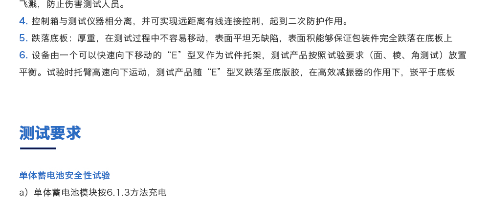 產品型號:JQ-315ST 品牌:劍 喬 用途:動力電池跌落試驗機主要用于評估各類鋰電池及鎳電池等其他一次電池,二次電池,蓄電池單體或電池組自由跌落(例如從臺面頂部)的安全性能。電池以不爆炸不起火為合格。咨詢熱線:13829135130